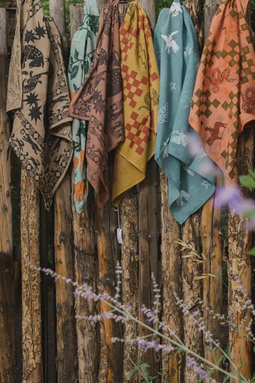 Using botanicals to dye my fabrics, each is pigmented with indigo blues, marigolds, madder root reds, and so on. I, then relief print with one of my carved stamps, allowing for each piece to be one-of-a-kind.